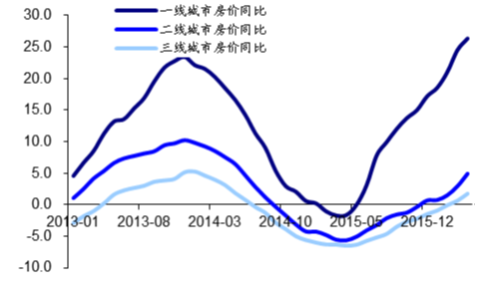 一、二線城市的平均土地成本已經大幅上升。新項目普遍會瞄準高端市場,制定較高的價格以彌補土地成本的大幅上升,從而推動銷售均價結構性上漲。三、四線城市的房地產市場面臨著高庫存和弱需求,尤其當前宏觀經濟低迷,我們預計2016年的三、四線城市房地產銷量將下降10%,銷售均價將下跌5%以上。