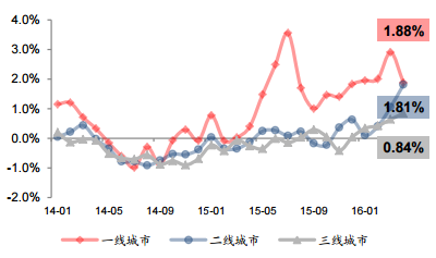 房?jī)r(jià)方面,2016年4月份百城住宅均價(jià)環(huán)比繼續(xù)上漲1.45%,漲幅小幅收窄0.45 個(gè)百分點(diǎn),同比來看,本月房?jī)r(jià)與去年同期相比上漲9%,同比連續(xù)9個(gè)月實(shí)現(xiàn)上漲, 且漲幅呈現(xiàn)逐月擴(kuò)大態(tài)勢(shì)。分城市來看,各線城市房?jī)r(jià)環(huán)比均上漲,其中一線城市 環(huán)比繼續(xù)領(lǐng)漲,但環(huán)比增幅下降1.03個(gè)百分點(diǎn)至1.88%,增幅逐步放緩,二線城市 環(huán)比上漲1.36%,增幅較上月擴(kuò)大0.72個(gè)百分點(diǎn),而三線城市環(huán)比增幅則略有擴(kuò)大, 由上月的0.89%小幅擴(kuò)大至本月的0.96%