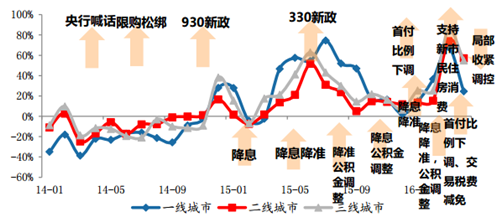 14以來政策與各線城市成交同比增速的走勢(shì)圖