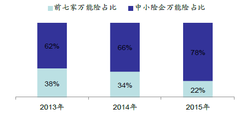 市場份額方面,“平臺類”等中小保險公司正在萬能險市場占據著領先地位。隨著2012 年以來中小保險公司高現價策略型萬能險業務高速增長,中小險企萬能險占比從2013 年的62%升至2015 年的78%。相應地,前七家(國壽、平安、太保、新華、泰康、太平、人保壽)萬能險市場份額明顯降低。