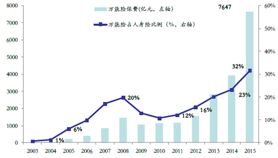 在保監會數據基礎上,我們用“保戶投資款新增交費”近似替代萬能險保費,用“原保險保費收入”、“保戶投資款新增交費”、“投連險獨立賬戶新增交費”之和作為業務口徑的人身險公司總保費。2015 年萬能險保費收入達7647 億元,萬能險保費占總保費比例從2005 年的6%提升至了2015 年的32%。