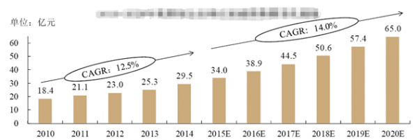 2010-2014 年,我國依達(dá)拉奉注射液市場銷售額保持增長態(tài)勢,由2010 年的18.4億元上升至2014 年的29.5 億元,2010-2014 年復(fù)合增長率達(dá)到12.5%;預(yù)計(jì)2020 年市場規(guī)模將達(dá)到65.0 億元,2015-2020 年復(fù)合增長率約14.0%。