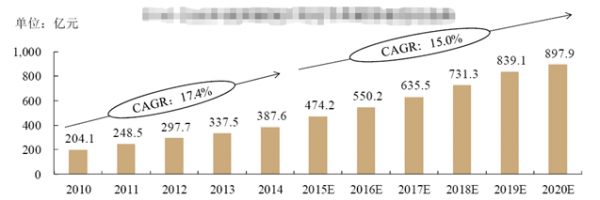 2010-2014 年,我國腦保護(hù)劑化學(xué)藥市場銷售額保持穩(wěn)定的增長,由2010 年的204.1億元上升至2014 年的387.6 億元,2010-2014 年復(fù)合增長率達(dá)到17.4%,雖然略低于腦血管疾病化學(xué)藥總體水平,但是也表現(xiàn)出較好的市場成長性;預(yù)計(jì)到2020 年市場規(guī)模將達(dá)到897.9 億元,2015-2020 年復(fù)合增長率約15.0%。