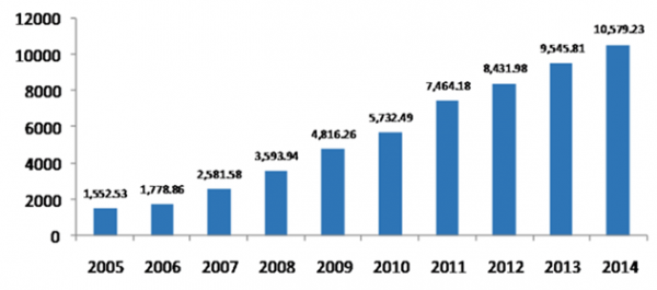 隨著財政收入的逐年增長及我國政府對醫療衛生事業的日益重視,我國政府在醫衛生事業方面的投入也迅速增加。如下圖所示,據國家衛計委統計,2014年我國政府衛生支出10,579.23 億元,較2009 年的4,816.26 億元增長了5,762.97億元,復合增長率為17.04%。