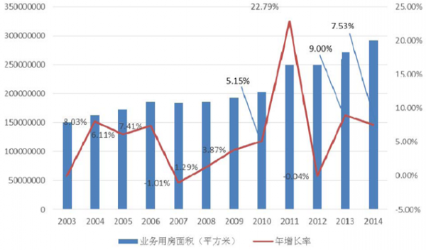 另一方面,《中國衛生統計年鑒》還顯示,我國醫療業務用房面積從2003年的1.51 億平方米增加至2014 年的2.92 億平方米,年平均增長9.3%,表明我國醫療業務用房面積呈增長態勢。