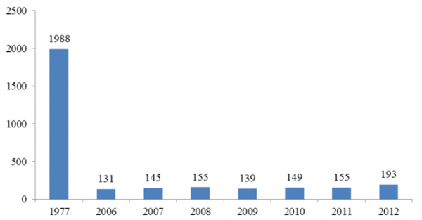盡管人工養殖魚子醬產量逐年增加,世界魚子醬供應也緩慢增長,但與歷史峰值相比,2012 年世界魚子醬產量僅為1977 年產量的10%。隨著野生魚子醬供應量的大幅減少和歐美主要消費市場立法禁止野生魚子醬進入市場,野生魚子醬將逐漸退出市場供應,人工養殖魚子醬將擁有巨大的市場空間。