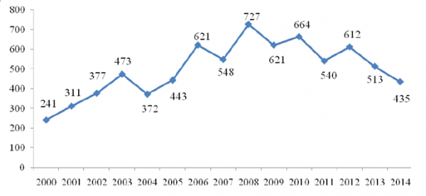 近年來魚子醬市場良好的供需形勢使得國際市場上魚子醬的價格一直處于較高水平。2000 年魚子醬的平均出口價約為240.59 美元/千克,到2008 年魚子醬的平均出口價已上升至約726.62 美元/千克,價格較2000 年增長了200%。受2008 年全球金融危機的影響,2009 年魚子醬價格回落至約621.42 美元/千克。2010 年魚子醬出口價格又有所回升,但受歐債危機的影響,2011 年歐洲市場的魚子醬價格略有下降、而美國和亞洲市場價格維持穩定。隨著人工養殖魚子醬產量的增長,2012 年以來世界魚子醬產品的貿易價格處于穩中略降的狀態。近年來世界魚子醬平均出口價格情況如下圖所示: