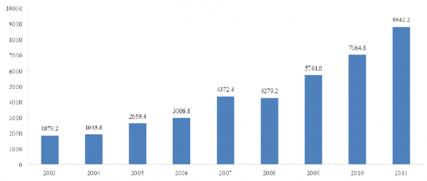 雖然我國已成為人工養殖鱘魚第一大國,但我國鱘魚養殖戶普遍呈現出投資額較小、養殖規模不大、養殖銷售的產品主要為商品鱘魚(1 千克/尾)等特點,受國內整魚消費習慣影響,該規格的商品鱘魚主要在當地生鮮水產市場進行銷售。隨著國內一批魚子醬加工企業的出現,我國鱘魚產業開始分化,占近80%的鱘魚養殖量仍為商品鱘魚的同時,以加工魚子醬為目的的鱘魚人工養殖規模也在逐年擴大。2006 年公司實現了我國人工養殖魚子醬的首次出口,標志著我國企業正式具備了加工高品質人工養殖魚子醬的能力。隨著公司后備原料鱘魚梯隊規模的不斷擴大及其他企業開始陸續進入本行業,我國以加工魚子醬為目的的鱘魚人工養殖量得以持續增長,2011 年已達到近9,000 噸的規模。根據我國水野分會對全國鱘魚養殖情況的調查,截至2014 年底,我國共有規模以上的鱘魚養殖單位63 家,其中后備原料鱘魚養殖單位40 家。2003 年-2011 年間,我國魚子醬后備原料鱘魚養殖情況如下圖所示: