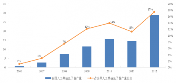 1984 年,世界各國人工養殖的鱘魚及魚子醬開始投放市場,并呈現逐年遞增的趨勢;2000 年,鱘魚養殖產量首次超過野生捕撈產量。但由于鱘魚成熟周期較長,人工養殖魚子醬的產量短期內并未快速增加,直到2007 年,人工養殖魚子醬產量才首次超過野生魚子醬產量,取代野生魚子醬成為市場供應的主力。2012年世界人工養殖魚子醬產量已達165 噸。