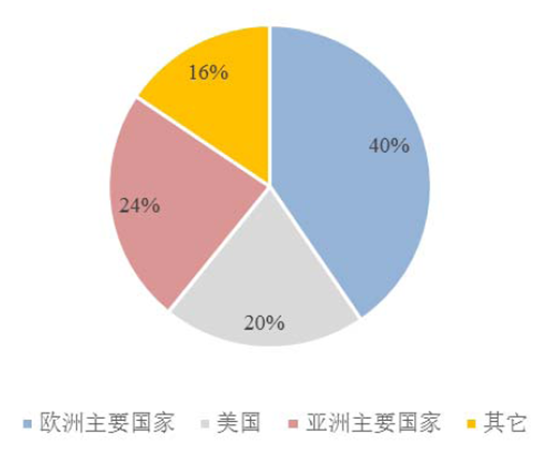 魚子醬的主要消費市場相對集中于歐洲、美國以及部分亞洲國家。根據CITES 貿易數據庫統計,2006 年-2011 年間歐洲、美洲和亞洲三個地區主要國家的魚子醬進口量合計達到約656 噸,占全球進口量總和的84%。2006 年-2011 年世界魚子醬進口量的區域分布情況如下圖所示: