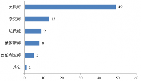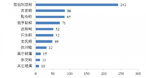 根據從CITES 貿易數據庫取得的各主要魚子醬生產國的出口數據統計,2006 年-2011 年,西伯利亞鱘魚子醬為出口量最大的品種。6 年中魚子醬累計出口量超過10 噸的鱘魚品種有9 個,具體如下圖所示: