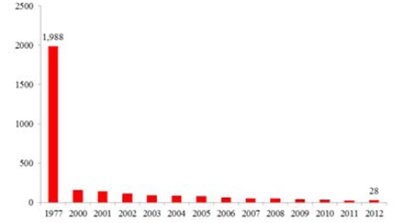 近年世界野生魚子醬產量與1977 年對比(噸)