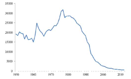 國外野生鱘魚資源主要分布在里海、伏爾加河、黑海和多瑙河等水域,其中里海的野生鱘魚資源約占世界的80%。俄羅斯擁有豐富的野生鱘魚資源,從16 世紀就已經開始捕撈野生鱘魚并加工魚子醬,被譽為魚子醬的故鄉。魚子醬消費不僅在俄羅斯、伊朗等里海周邊國家盛行,也逐漸傳到了歐洲、美國和亞洲,形成了具有近500 年歷史的穩定消費市場。長期的酷漁濫捕、環境污染以及水利工程筑壩等人類活動對野生鱘魚生態的破壞導致世界野生鱘魚資源急劇下降。大規模的野生鱘魚商業捕撈在20 世紀中葉達到了高潮。據聯合國糧農組織(FAO)統計1,1950 年-1990 年間世界野生鱘魚的捕撈量均維持在每年1.5 萬噸以上,并于1976 年和1977 年達到了年捕撈量3 萬多噸的峰值,同時野生魚子醬產量也于1977 年達到了約1,988 噸的歷史峰值2。到1997 年,世界野生鱘魚的年捕撈量已下降至4,485 噸,較1977 年下降85%,同時野生魚子醬產量也降至約280 噸,僅為1977 年產量的15%左右。