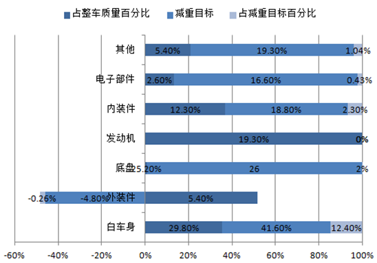 合金材料密度(g/cm3)優點缺點應用部位鎂合金1.74具有良好的鑄造性能及加工性能,100%可回收成本高于鋁合金,抗腐蝕、抗高溫蠕動,抗疲勞性能差殼體類:離合器外殼、變速箱體、發動機前蓋等;支架類:方向盤、座椅支架等鋁合金2.7制造技術、機械性能、物理性能、抗腐蝕性、可持續發展等方面綜合性能好成本高、抗承載能力較弱鑄造鋁合金:動力系統和輪轂等大型零部件;變形鋁合金:車身、保險杠、車廂底板、汽車空調系統等結構件及儀表板等裝飾件鈦合金4.51強度最高,熱膨脹系數低,,可塑性好易加工,無磁性、抗腐蝕,對環境無污染。成本較高發動機部件:閥門、閥簧、閥簧承座、連桿等;底盤部件:彈簧、排氣系統、半軸、緊固件等;車身鎂密集輕量化概念車減重目標的分解