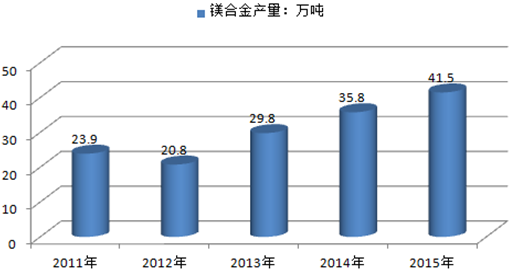2013年我國鎂合金產量為29.78萬噸,同比2012年,增長率高達43.52%,國內鎂合金消費量為19.59萬噸。2014年我國鎂合金產量35.83萬噸。2015年我國鎂合金產量為41.5萬噸,消費量為30.0萬噸。