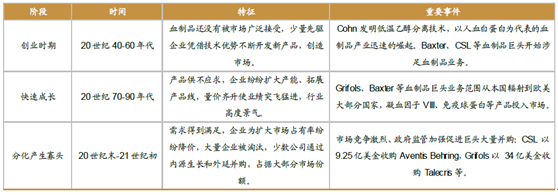 國外血制品行業發展大致可以分為創業階段、快速成長階段、分化產生寡頭階段。