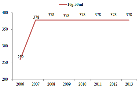 2006-2013年白蛋白最高零售價變化趨勢(元)