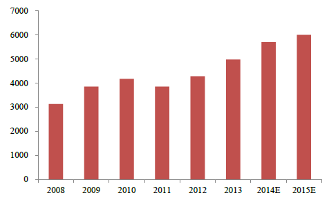 2008-2015年我國血漿采漿量變化趨勢(噸)