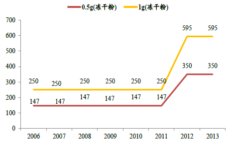 在最高零售價取消之前,各種血制品的價格逐步提升,如發改委于2007 年將10g:50ml規格的白蛋白最高零售價從259 元上調到378 元,2011 年將0.5g 人纖維蛋白原凍干粉的最高零售價也從147 元上調到350 元。
