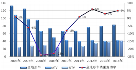 全地形車市場消費需求變化與全球宏觀經濟、 消費地區微觀經濟的變化密切相關,受2008年金融危機影響,全球全地形車銷量由2006年的133.1萬臺迅速下降至2010年的66.5萬臺,2011年后逐年上升至2014年83.2萬臺;2006年至2014 年期間,全地形車銷售也發生了結構性變化,ATV 銷售與全地形車整體銷售變動趨勢一致,而 UTV 則保持了較好的增長態勢,2006 至 2014 年復合增長率達 6.85%4。