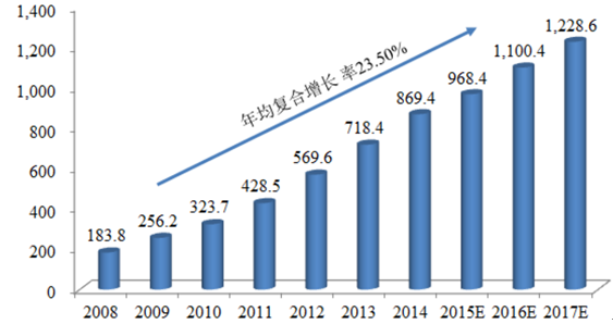 大型角色扮演類客戶端網絡游戲銷售收入增長迅速,銷售收入由 2008 年的150.8 億元增長至 2014 年的 389.1 億元,預計 2017 年大型角色扮演類客戶端網絡游戲市場銷售收入將達到 491.6 億元人民幣。
