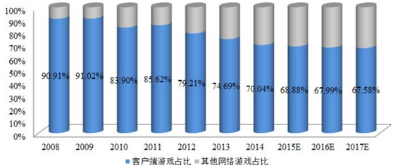 與網頁游戲相比, 客戶端網絡游戲在游戲內容上更為豐富, 玩法上更具深度,且擁有更好的畫面、音效和操作響應能力,所以客戶端網絡游戲的玩家更具穩定性。游戲工委《2012 年中國游戲產業報告》顯示,從目前的市場規模和中國網絡游戲市場的發展來看,在未來相當長的一段時間內,客戶端網絡游戲仍將保持第一的市場份額。2014 年國內客戶端網絡游戲市場銷售收入 608.9 億元人民幣,比 2013 年增長 13.47%,約占中國網絡游戲市場銷售收入的70.04%。