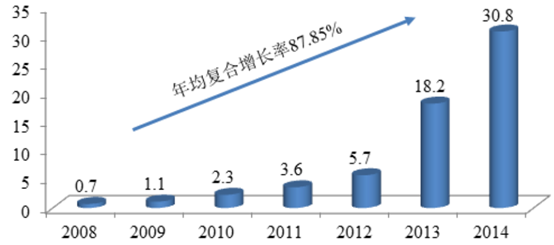 2008-2014 年中國移動游戲市場銷售收入 (單位:億元)