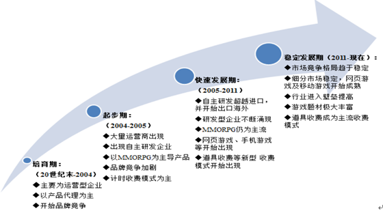 中國網絡游戲行業起始于 20 世紀末,經過十多年的發展,經歷了產業培育期、產業起步期、快速發展期和穩定發展期等四個主要發展階段。具體如下: