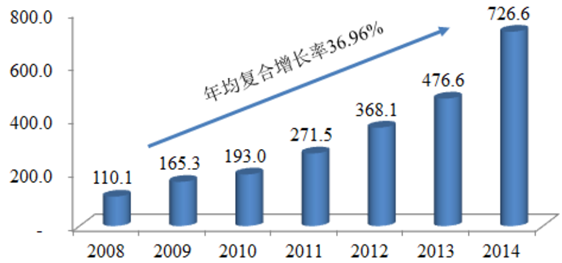 中國互聯網絡信息中心的數據顯示,截至 2014 年 12 月底,中國互聯網用戶數量已達到 6.49 億。在國內互聯網用戶持續增加的背景下,伴隨著國內網絡游戲企業研發能力和運營能力的不斷提升, 國內網絡游戲市場規模呈現持續快速增長的態勢。游戲工委發布的《2014 年中國游戲產業報告》顯示,2014 年中國網絡游戲市場銷售收入為 869.40 億元人民幣,比 2013 年增長了 21.02%。 (此處網絡游戲市場收入不包含移動游戲市場收入和單機游戲市場收入)