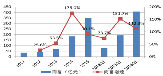 5、當前行業仍處于并購高峰期。2015年軟件行業商譽350億元,同比增長93.5%,較上年下滑了76.6個百分點,表明行業仍然處于并購的高峰期。2016年1季度,軟件行業商譽總計408億元,同比增長112.3%。