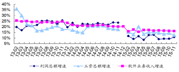 截止2015年前11個月份,軟件行業實現利潤總額4422億元,同比增長10.8%,低于行業增速5.4個百分點,盈利能力較上年同期下滑較為明顯。其中從業人員總計552萬人,同比增長6.4%,工資總額增長12.6%,低于行業的收入增速3.6個百分點,由此判斷行業業績主要受到除人力以外的其他因素的拖累。