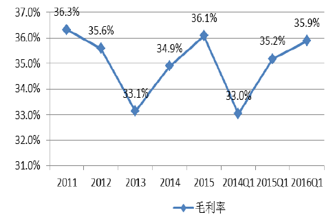 2015年行業毛利率持續提升。2015年軟件行業實現毛利573億元,同比增長21.2%,行業毛利率36.1%,較上年上漲了1.2個百分點。同樣,2016年1季度行業毛利115億元,同比增長27.86%,繼續呈現上升態勢,毛利率35.9%,亦較上年同期上漲了0.7個百分點。