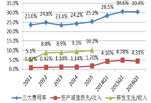 2015年在毛利率提升的背景下,行業營業利潤率、凈利率分別為10.1%、10.6%,分別較上年同期增長了-0.1、0.2個百分點。在各項費用支出中,研發費用支出、資產減值損失對業績形成了明顯的拖累。