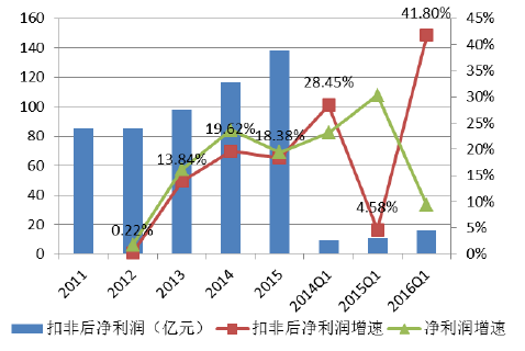 2011-2016年Q1軟件行業扣非后凈利潤及增速