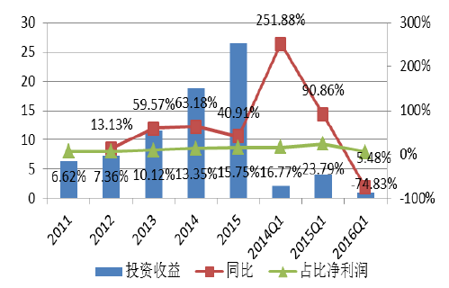 4、2016年1季度,行業營業利潤率、凈利率分別為4.3%、5.7%,較上年同期分別下滑了0.5、0.8個百分點。其中投資收益的波動極大地拖累了行業盈利能力,1季度行業投資收益9978萬元,較上年同期的3.96億元(其中僅大智慧貢獻收益高達2.08億元)大幅下滑了74.83%,占當季凈利潤的比例也由23.79%下滑到5.48%。除去這類非經常性損益的影響,1季度行業扣非后凈利潤同比增長41.8%,遠高于凈利潤9.3%的增速。