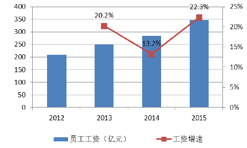 2、軟件行業加大了對研發和人員方面的支出。2015年行業研發支出總計162億元,同比增長27.7%,較上年提升了7.8個百分點,高于行業增速10.5個百分點,促進了管理費用率的提升,但長期來看有利于行業的持續發展。全年來看,行業內上市公司擁有的員工總數為26.2萬人,同比增長18.3%,較上年同期上漲8.7個百分點;行業員工工資支出348億元,同比增長了22.3%,較上年同期提升了9.1個百分點,也對費用提升形成了較大壓力。