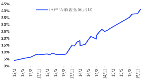 自 2013 年末起,IH 電飯煲銷售占比持續上升,帶動電飯煲均價迅速提升。中怡康數據顯示, IH產品的銷售金額占比已經從 2013 年的 11%上升到 2015 年的 33%左右。2016 年 2 月份,國內 IH 電飯煲市場均價為 910 元,而電飯煲整體市場均價僅 199 元。2015 年,以 IH 電飯煲入門產品為主的 500 -700 元價格段產品份額上升 2 個百分點,而 150 元以下產品份額快速下降,電飯煲產品結構在 IH 電飯煲的帶動下大幅改善。