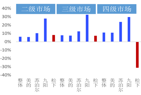 從2015 年的數據來看,三四級電飯煲市場增速正在超越一二級市場,消費升級從一二級市場向三四級市場延伸的趨勢明顯。本土龍頭在三四級市場表現出色,蘇泊爾和九陽取得遠高于行業的零售額增速,而松下等國外品牌在三四級市場明顯增長乏力。未來三四級市場的消費升級將成為電飯煲市場保持高增長的重要引擎,對于國外品牌等新進入者來說,三四級市場存在較高的渠道壁壘。