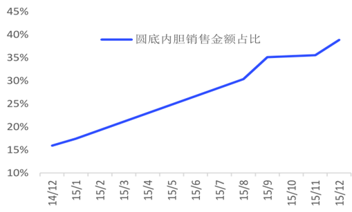 國內廠商集體推出 IH 電飯煲產品和集中宣傳讓 IH 電飯煲火起來,從零售數據可以明顯看到,IH 產品的銷售金額占比在 2013 年末只有 10%左右,之后一路上升,目前已達到 40%。除此之外,圓底內膽也在蘇泊爾“球釜”等概念的推動下有明顯增長。