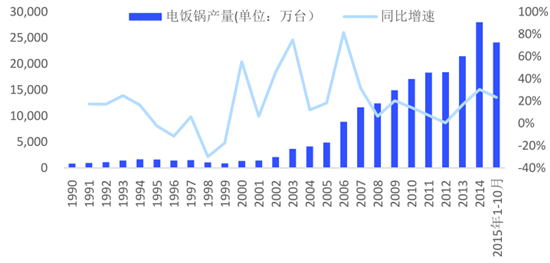 我國一直是世界上最大的大米消費國,電飯煲也自然而然地成為普及率最高的廚房小家電品種。同時,我國也是電飯煲生產大國,2000 年到2014 年, 電飯煲產量年復合增速為 24%, 2014 年產量達到 2.8 億臺。 2015年 1-10 月產量為 2.4 億臺,同比增長 23%。