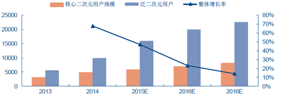 伴隨著消費(fèi)意識(shí)的提升,中國(guó)的二次元人群正在逐步擴(kuò)容,相關(guān)文化市場(chǎng)的熱情也在逐步攀升。調(diào)查數(shù)據(jù)顯示,2015 年,我國(guó)二次元消費(fèi)者規(guī)模或已逾2 億,其中,核心用戶占比達(dá)到27.1%;且消費(fèi)者人數(shù)有望在今后的幾年之內(nèi)依然保持兩位數(shù)的快速增長(zhǎng)。