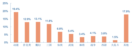 移動(dòng)游戲各題材分布一覽(單位:%)