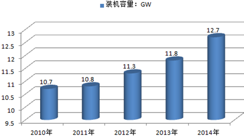 2010-2014年全球地熱能發電累計裝機容量(GW)