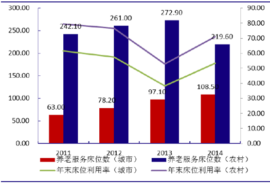 2010-2014年我國養(yǎng)老服務(wù)床數(shù)及床位利用率
