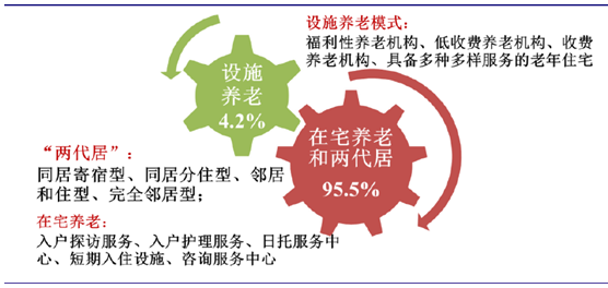 設(shè)施養(yǎng)老類似于我國的機(jī)構(gòu)養(yǎng)老,即以養(yǎng)老院的形式提供養(yǎng)老服務(wù),分為公立、低費(fèi)和完全自費(fèi)三種,供用戶根據(jù)自身情況選擇。2)從市場份額上看,選擇在宅養(yǎng)老和兩代居等形式的老人比例超過95.5%,居家養(yǎng)老占據(jù)市場絕對(duì)主流,與中國的情況相似。