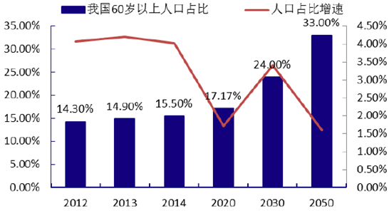 2012-2050年中國60 歲以上人口趨勢(shì)及增速預(yù)測(cè)
