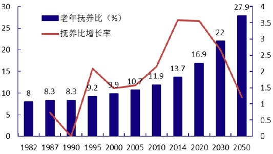 1982-2050年中國老年撫養(yǎng)比持續(xù)增長