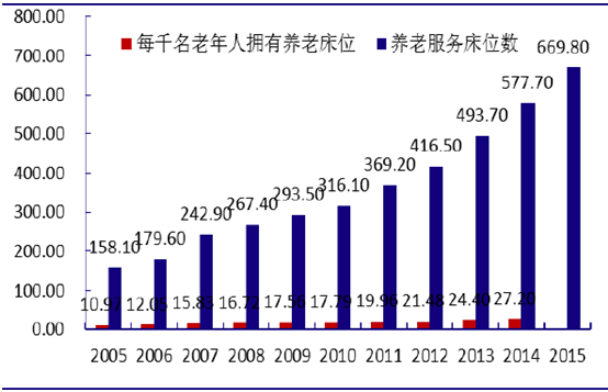2005-2015年中國養(yǎng)老服務(wù)床位數(shù)及每千名老人擁有養(yǎng)老床位