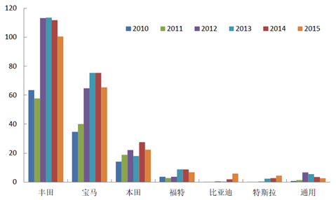 全球七大汽車集團(tuán)新能源汽車銷量統(tǒng)計(jì)(EV+HV+PHV,單位:萬(wàn)輛)
