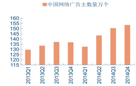 數(shù)據(jù)顯示,2014 年第四季度,我國(guó)網(wǎng)絡(luò)營(yíng)銷(xiāo)的廣告主數(shù)量已經(jīng)達(dá)到 153.5 萬(wàn)個(gè),平均每個(gè)廣告主的 ARPU 值突破 3000 元,較 2013 年初分別上升了 18%和 121%,表現(xiàn)出在需求市場(chǎng)上廣告主對(duì)網(wǎng)絡(luò)營(yíng)銷(xiāo)的追捧。